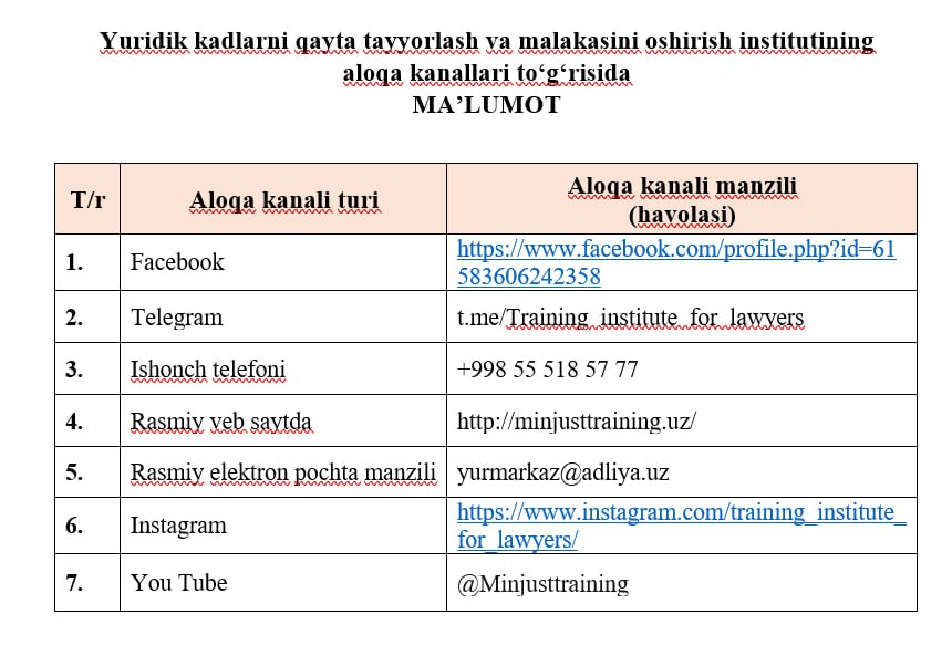 Adliya organlari va muassasalari xodimlari, advokatlar, notariuslar, yuriskonsultlar, patent vakillari, mediatorlar hamda boshqa soha mutaxassislarini qayta tayyorlash va malakasini oshirishda Oʻzbekiston Respublikasi qonun hujjatlari va Institutning ichki hujjatlariga muvofiq halol, adolatli va obyektiv asosda taʼlim berilishi lozim;