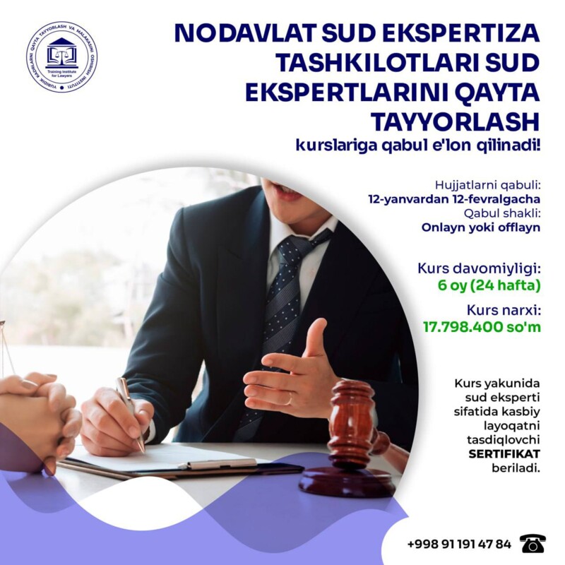Ўзбекистон Республикаси Президентининг “Маъмурий ислоҳотлар доирасида адлия органлари ва муассасаларининг масъулиятини янада ошириш ҳамда ихчам бошқарув тизимини шакллантириш тўғрисида” 2024-йил 24-майдаги ПФ-80-сон Фармони ижросини таъминлаш, шунингдек, адлия органлари ва муассасалари ходимлари, юридик хизмат, адвокатура, нотариат, медиация, интеллектуал мулк, суд экспертизаси, архив иши ва иш юритиш ҳамда бошқа соҳа мутахассисларини узлуксиз касбий ривожлантиришнинг замонавий тизимини йўлга қўйиш ҳамда уларни ўқитишни халқаро тажриба ва замонавий таълим стандартлари талабларидан келиб чиққан ҳолда такомиллаштириш мақсадида Ўзбекистон Республикаси Вазирлар Маҳкамасининг Ўзбекистон Республикаси Адлия вазирлиги ҳузуридаги Юридик кадрларни қайта тайёрлаш ва малакасини ошириш институти фаолиятини ташкил этиш чора-тадбирлари тўғрисида171-сон қарори билан ташкил этилган. ...